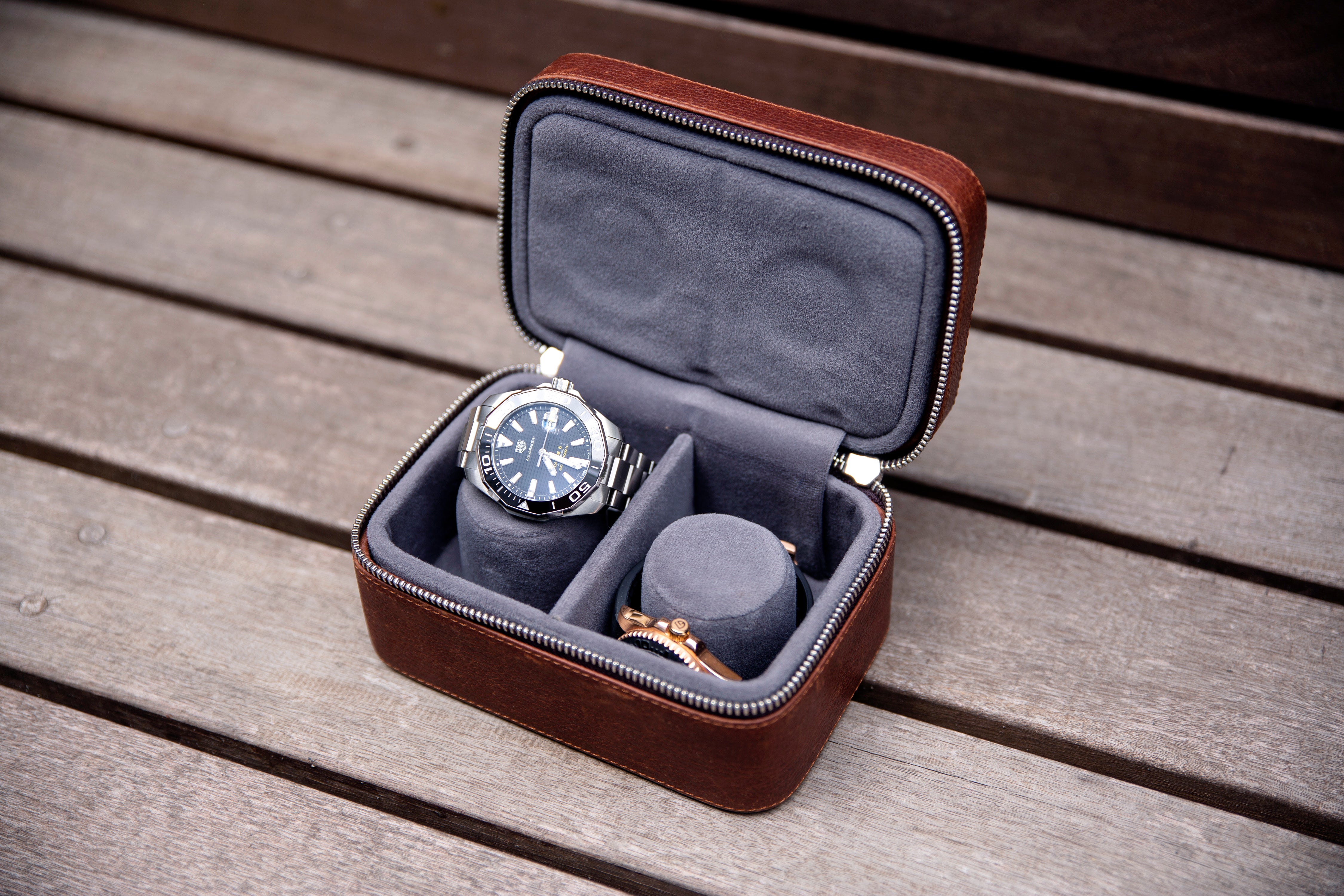 The Watch Wallet is designed to be the most protective case you'll ever own for two watches. Completely protect your bezels by not exposing them. The pillars are wrapped in memory foam, which allows mens watches to comfortably fit and remain secure in the case.